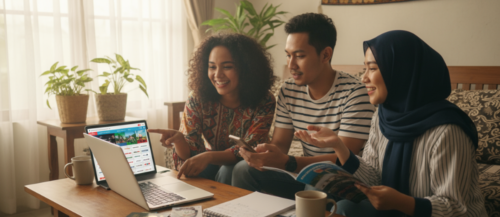Buat daftar semua komponen biaya: tiket pesawat, penginapan, makan, transport lokal, oleh-oleh, dan dana cadangan. Artikel menyebut pentingnya “menyiapkan dana liburan secara rutin” agar bisa bebas beban.