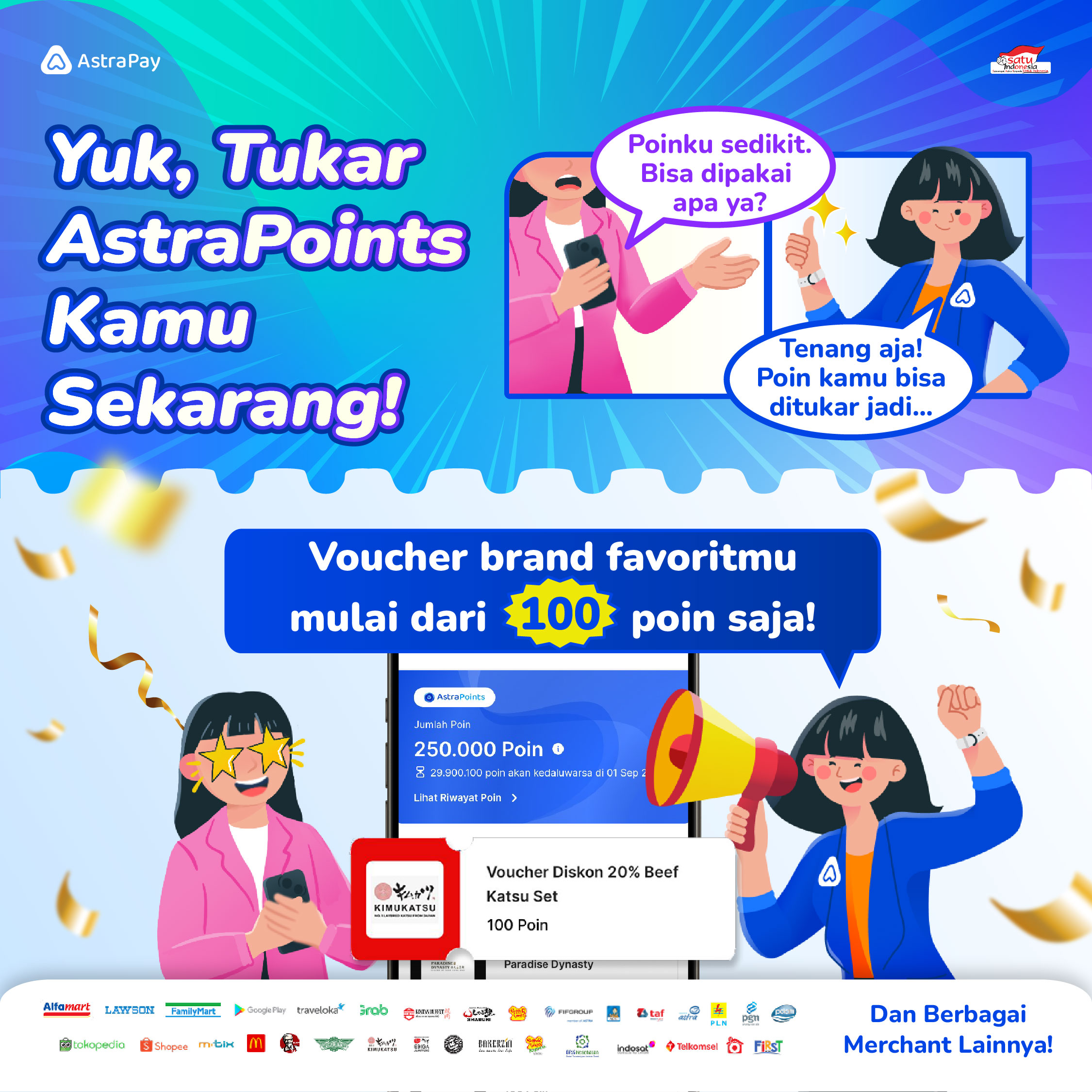 AstraPoints kamu dapat ditukar dengan voucher belanja di 20.000 merchant seperti Indomaret, Tokopedia, Grab, dan lainnya.