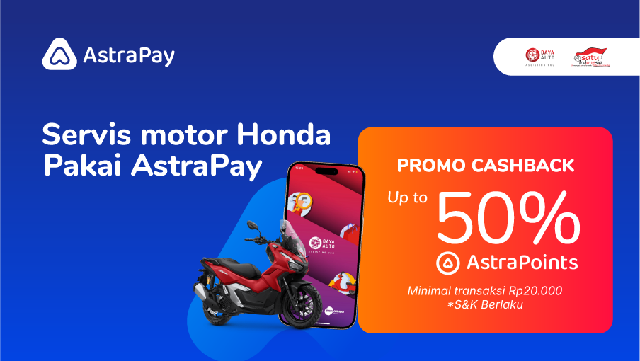Service kendaraan Honda di DAYA AUTO sekarang makin untung! Nikmati cashback AstraPoints hingga 50% (maks 10.000 AstraPoints) dengan minimum transaksi Rp20.000. Promo hanya berlaku 1 kali per user. Cek syarat & ketentuan lengkapnya sebelum transaksi, ya!