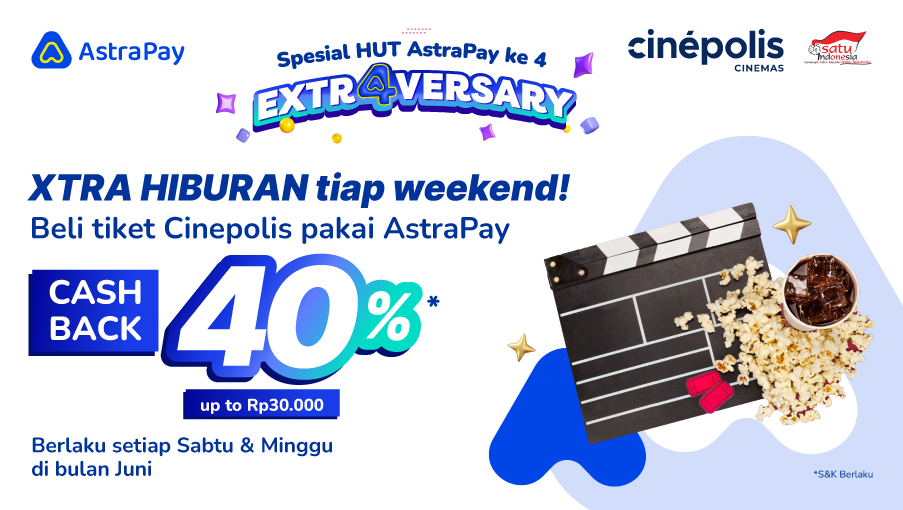 Promo spesial Extr4versary AstraPay! Rayakan HUT ke-4 AstraPay dengan promo spesial untuk pembelian tiket Cinepolis pakai QRIS AstraPay.
