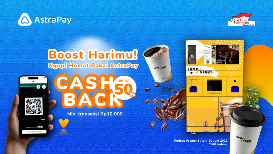 Jajan makin hemat pakai AstraPay! Nikmati cashback 50% hingga Rp5.000 untuk setiap pembelian di mesin Jumpstart menggunakan saldo AstraPay. Jangan lupa cek syarat & ketentuan lengkapnya sebelum bertransaksi, ya!