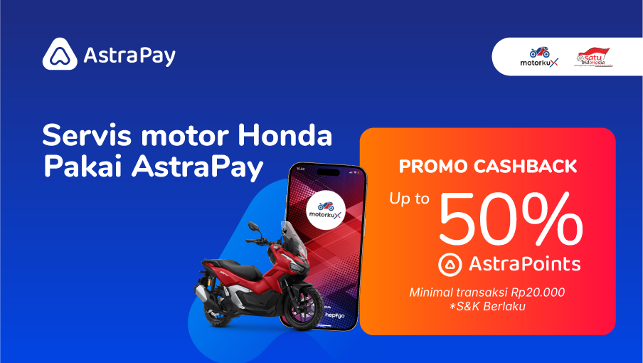 Booking service kendaraan Honda sekarang jadi lebih simple dan menguntungkan pakai MotorkuX! Bukan sekadar service, nikmati cashback AstraPoints hingga 50% (maks 10.000 AstraPoints) dengan minimum transaksi Rp20.000. Promo hanya berlaku 1 kali per user. Yuk booking service kendaraanmu di MotorkuX, praktis, aman, dan untungnya maksimal! Cek syarat & ketentuan lengkapnya sebelum transaksi, ya!