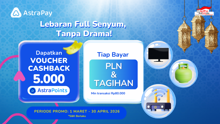 Kini bayar PLN & Tagihan makin praktis sekaligus menguntungkan! Cukup lakukan transaksi minimal Rp80.000 dan dapatkan voucher cashback 5.000 AstraPoints. Cek syarat & ketentuan lengkapnya sebelum transaksi, ya!
