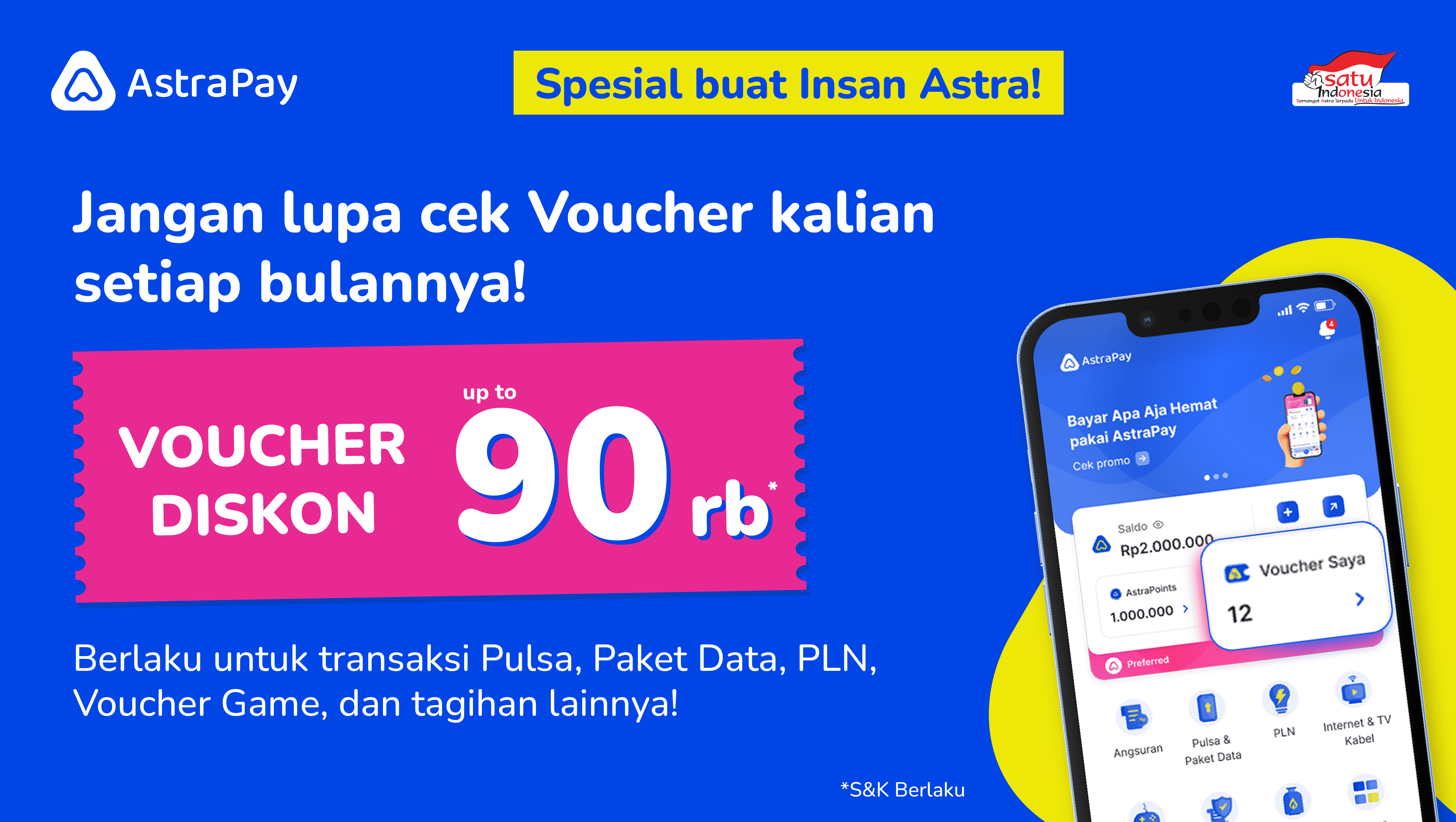 Voucher Spesial Tiap Bulan, Khusus Buat Insan Astra! Kini makin hemat bayar kebutuhan harianmu, mulai dari pulsa, paket data, token listrik, hingga voucher game. Jangan lupa cek tab “Voucher Saya” di aplikasi AstraPay setiap awal bulan dan manfaatkan diskon hingga Rp90.000! Yuk, langsung cek voucher kalian dan jangan lupa baca S&K yang berlaku, ya!