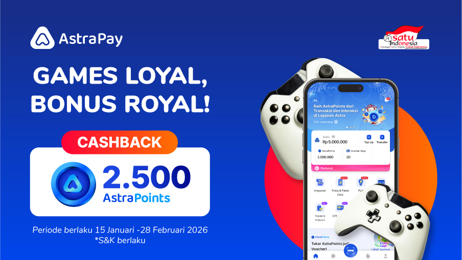 Top up Voucher Games pakai AstraPay jadi makin untung. Cukup lakukan transaksi minimal Rp15.000 dan dapatkan Cashback AstraPoints senilai 2.500 langsung ke akun AstraPay. Main tetap jalan, poin juga nambah—manfaatkan sebelum kuota promonya habis.