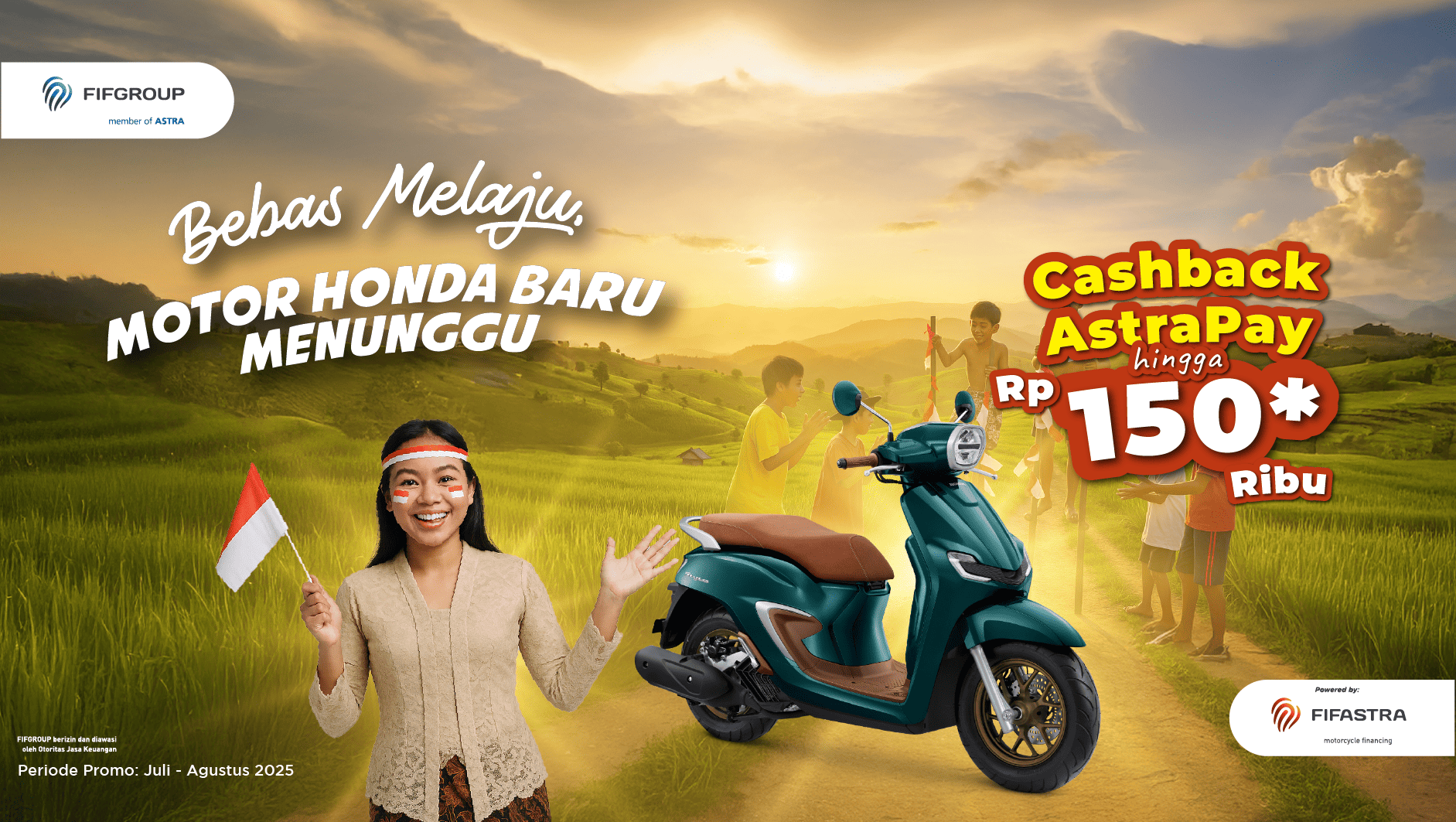 Rayakan kemerdekaan dengan langkah baru bareng motor Honda impianmu! Selama periode promo, setiap pembelian motor Honda di dealer terpilih bisa dapetin cashback AstraPay hingga Rp150.000.