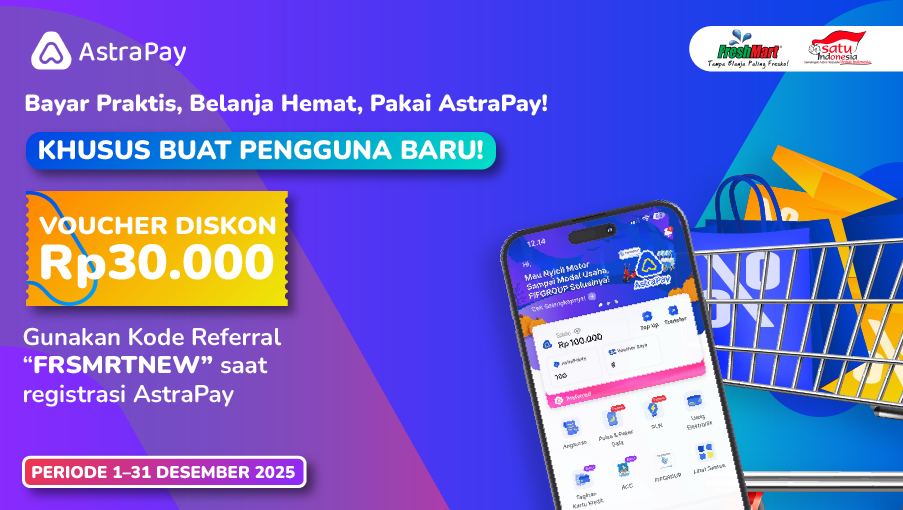 Daftar AstraPay sekarang pakai kode referral “FRSMRTNEW” dan langsung dapatkan voucher diskon Rp30.000. Cukup dengan minimal belanja Rp200.000 di FreshMart Manado, kamu bisa menikmati potongan secara langsung. Jangan tunggu lagi, ayo nikmati belanja praktis dan hemat dengan AstraPay! Cek syarat & ketentuan selengkapnya agar kamu bisa nikmati promo dengan mudah!