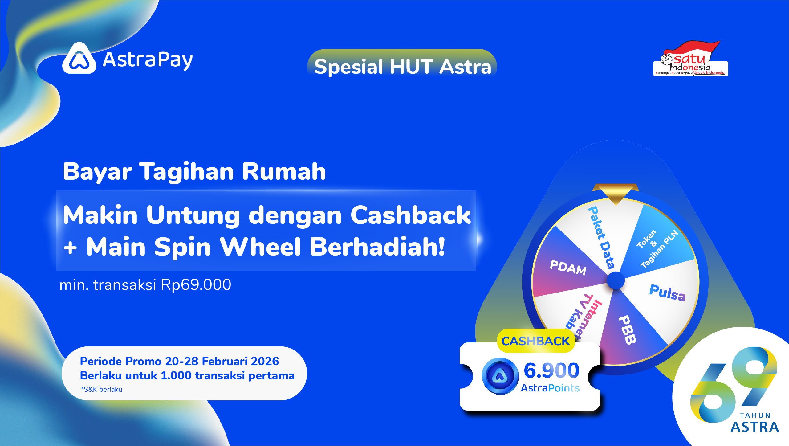 Rayakan HUT Astra dengan promo spesial untuk berbagai kebutuhan harian di AstraPay. Dapatkan cashback 6,9% hingga maksimal 6.900 AstraPoints dan kesempatan bermain spin wheel dengan minimal transaksi Rp69.000 untuk pembelian Token & Tagihan PLN, Pulsa, PBB, Internet TV Kabel, PDAM, dan Paket Data. Transaksi makin untung, hadiah pun berpeluang didapat—selama kuota promo masih tersedia.