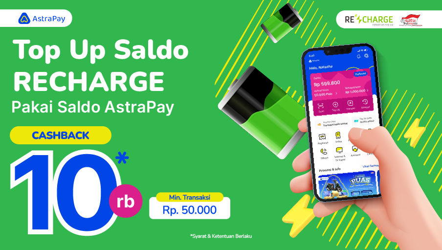 Udah gitu, ada promo spesial dari AstraPay untuk kamu yang mau top up ReCharge karena ada Cashback Rp 10ribu untuk top up Rp 50ribu!