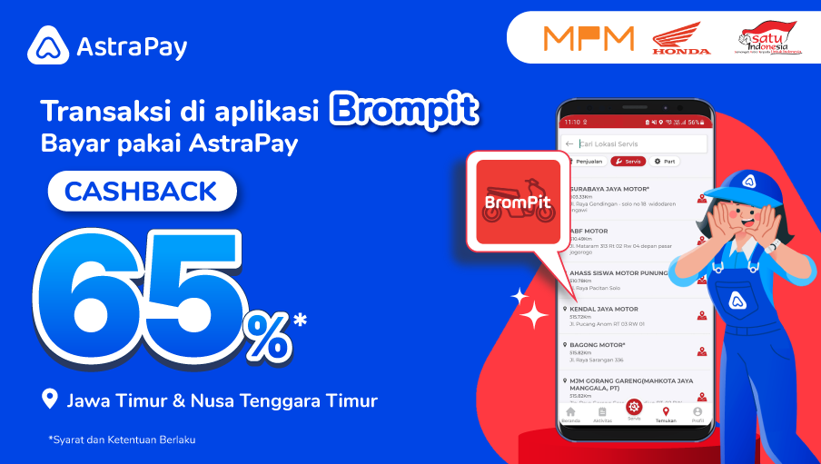 Belanja spareparts hingga booking servis tidak pernah semudah ini! Sekarang kamu bisa menggunakan AstraPay sebagai metode pembayaran di aplikasi Brompit. Selain praktis, khusus bulan ini juga ada cashback saldo 65%. Tunggu apalagi? Segera buka aplikasi dan nikmati bonusnya sebelum terlambat!