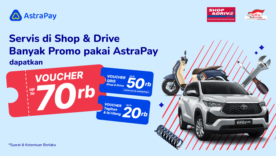 Servis makin untung dan banyak promonya, mulai dari diskon, bundling, hingga cashback! Yuk, servis kendaraan kesayangan kamu ke outlet Shop and Drive dan dapatkan voucher diskon up to Rp70.000 untuk diskon servis hingga PPOB. Dapatkan promo ini di seluruh outlet Shop And Drive terdekat yang sudah bekerjasama dengan AstraPay.