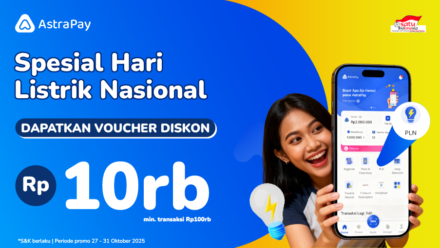 Kabar gembira untuk kamu pengguna setia AstraPay! Mulai tanggal 27–31 Oktober 2025, kamu dapat menikmati voucher diskon Rp10.000 setiap melakukan transaksi PLN lewat aplikasi AstraPay.