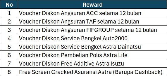 Hadiah Spin Wheel berupa Kode Gift Voucher (AstraPoints) dan Kode Promo berupa cashback (yang digunakan sebelum transaksi selanjutnya) sesuai reward yang muncul pada aplikasi. Berikut detail nya: