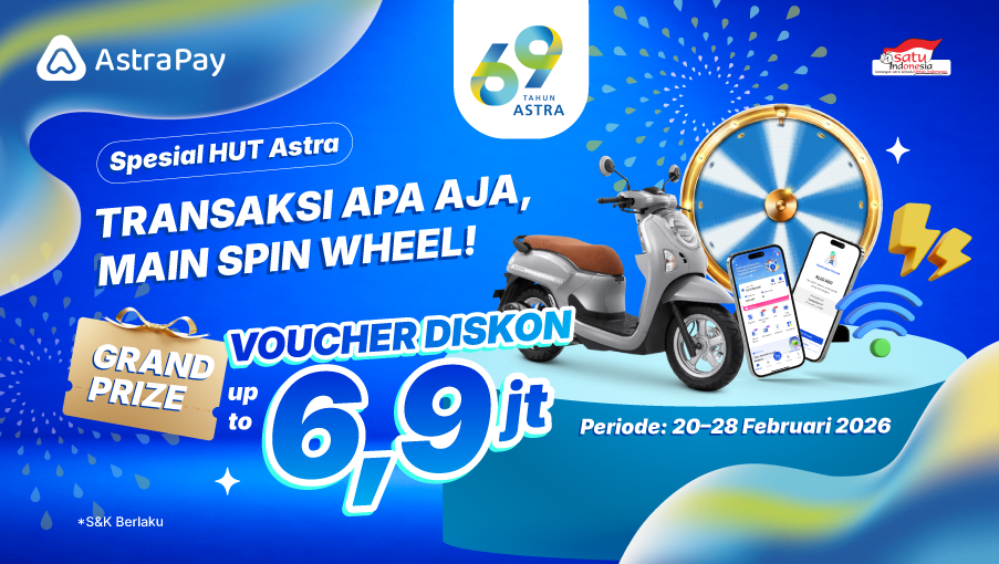 Rayakan HUT ke-69 Astra bareng AstraPay! Cukup lakukan transaksi minimal Rp69.000, kamu langsung berkesempatan main Spin Wheel dengan hadiah beragam dari voucher pilihan hingga doorprize spesial menanti kamu