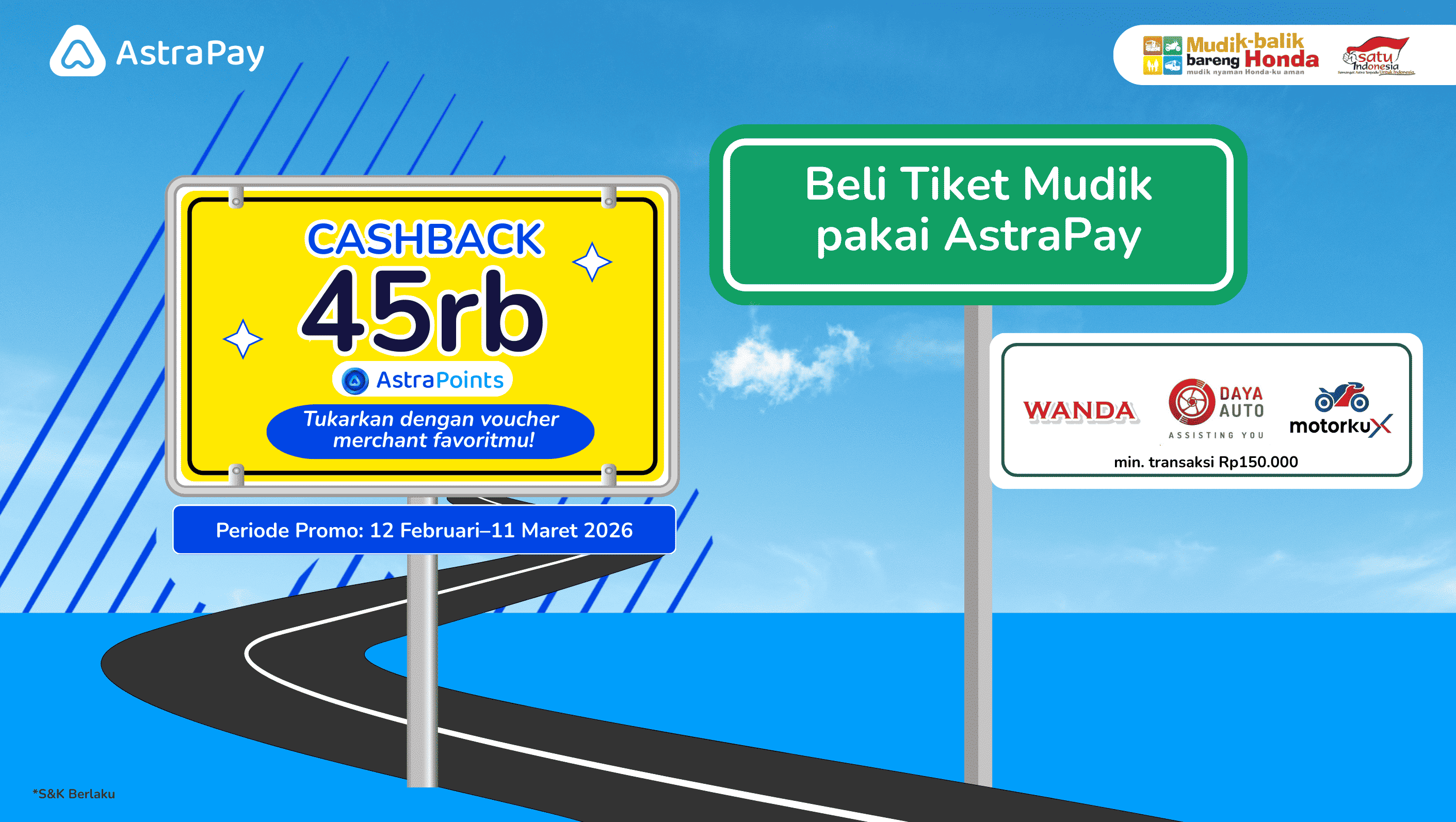 Siap mudik aman dan hemat? Beli tiket Mudik Balik Bareng Honda rute Jakarta-Semarang/Jogja (PP) dengan transaksi minimal Rp150.000 pakai AstraPay, langsung dapat Cashback 45.000 AstraPoints! Kamu bisa tukarkan mulai dari 100 AstraPoints dengan berbagai voucher menarik. Yuk, beli tiket mudik sekarang!