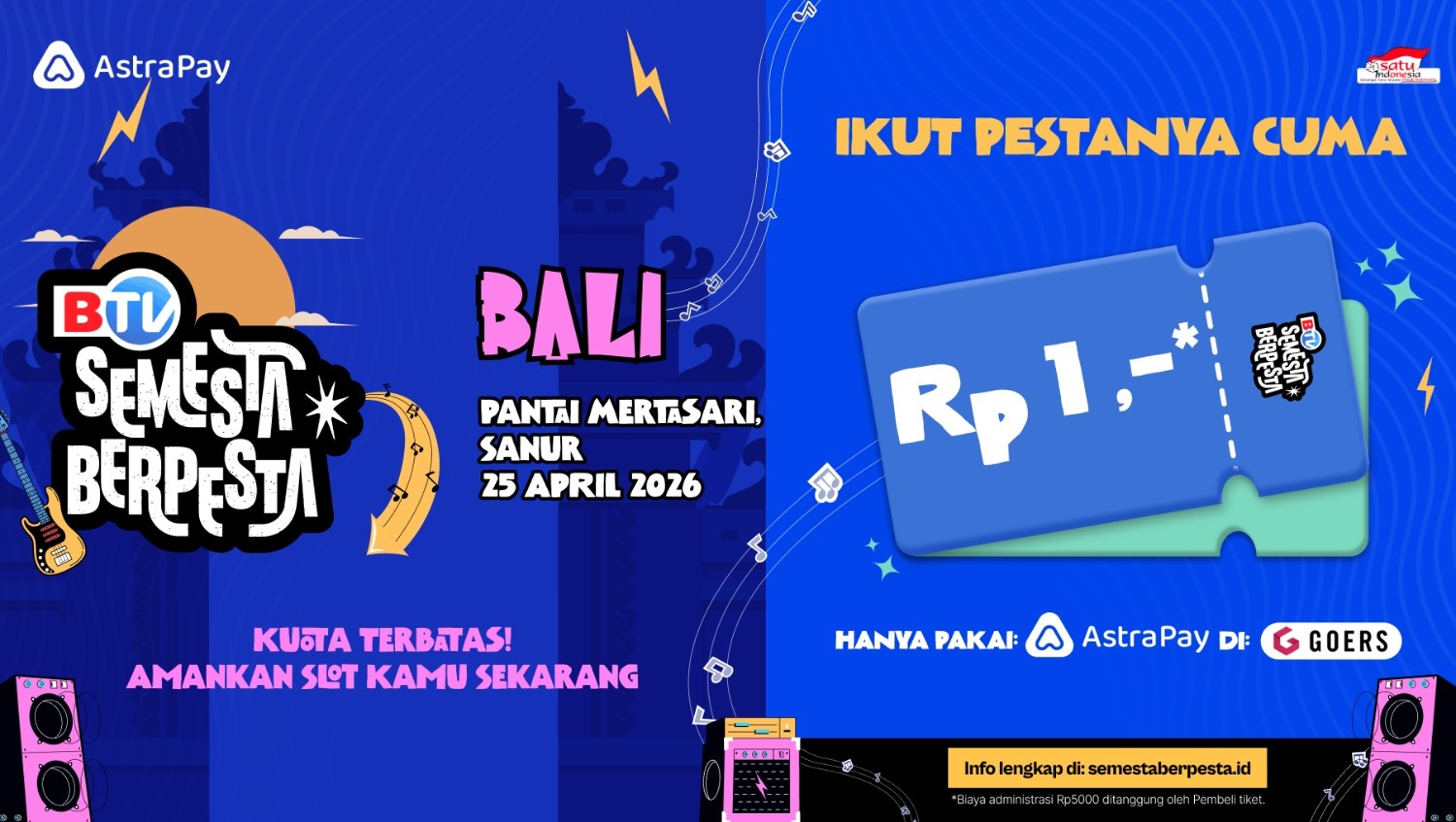 Konser Semesta Berpesta 2026 hadir tanggal 25 April 2026 dengan lineup seru: Kotak, Lomba Sihir, Milledenials, dan Meiska. Kamu bisa dapetin tiketnya cuma Rp1! Caranya? Beli di website Goers dan bayar pakai AstraPay. Yuk, jangan sampai kehabisan! Jangan lupa cek syarat & ketentuan selengkapnya yaa!