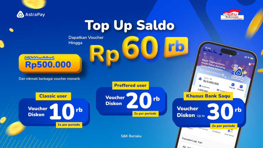 Mau transaksi makin untung? Cukup top up saldo AstraPay kamu minimal Rp500.000 dan nikmati voucher diskon hingga Rp60.000! Yuk isi saldo AstraPay kamu sekarang dan jangan lupa cek syarat & ketentuan lengkap sebelum transaksi, ya!