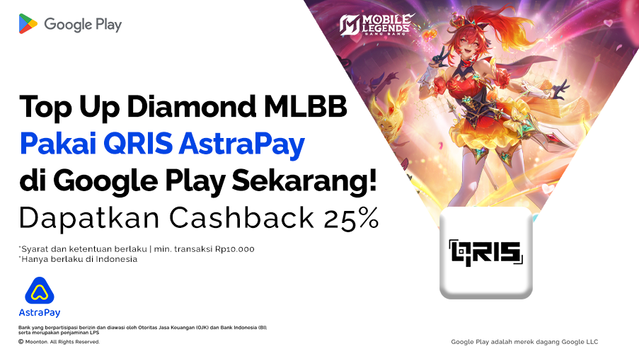 Bukan cuma jago main, tapi juga jago hemat! Top up Mobile Legends lewat QRIS Google Play di aplikasi AstraPay dan dapetin voucher cashback 25% hingga Rp10.000. Langsung beli Diamond, upgrade skin, atau push rank bareng squad tanpa nunggu gajian! Promo berlaku 1–31 Oktober 2025.