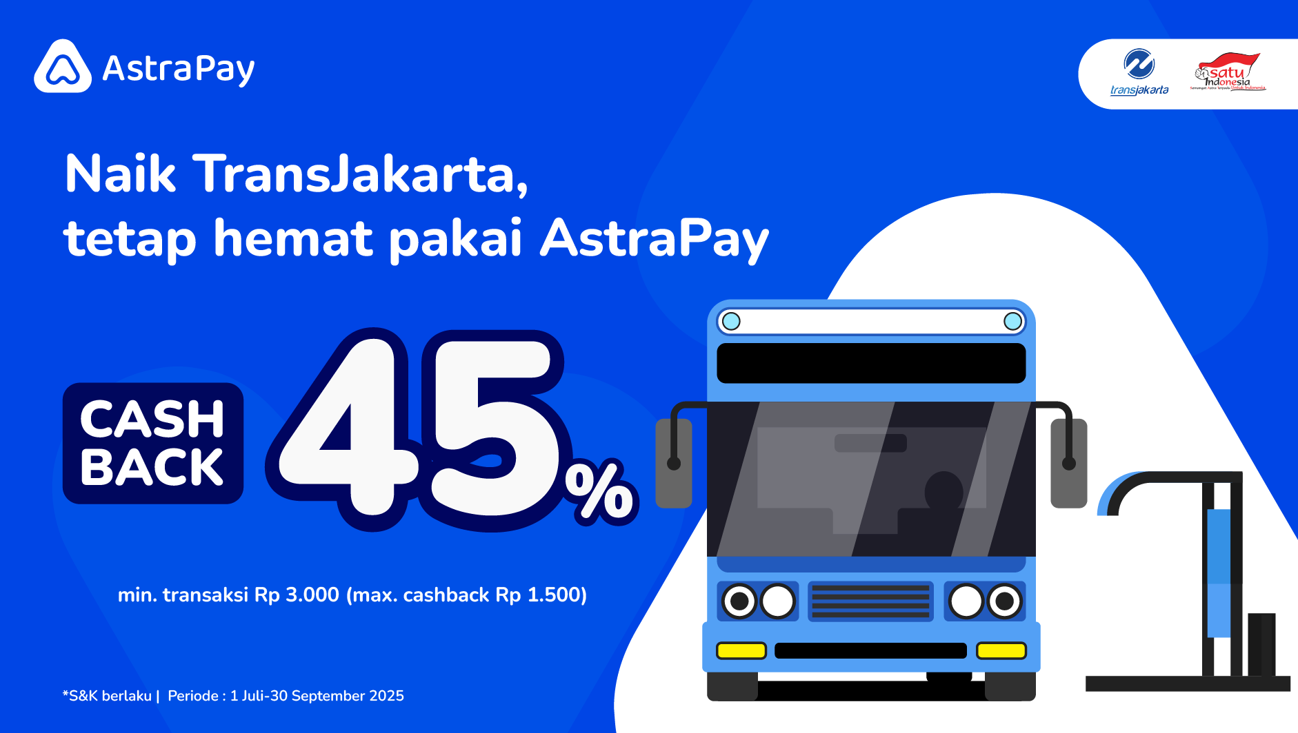 Promo berupa cashback sebesar 45% (Maksimal cashback Rp1.500) dalam bentuk saldo AstraPay dengan minimum transaksi sebesar Rp3.500.
