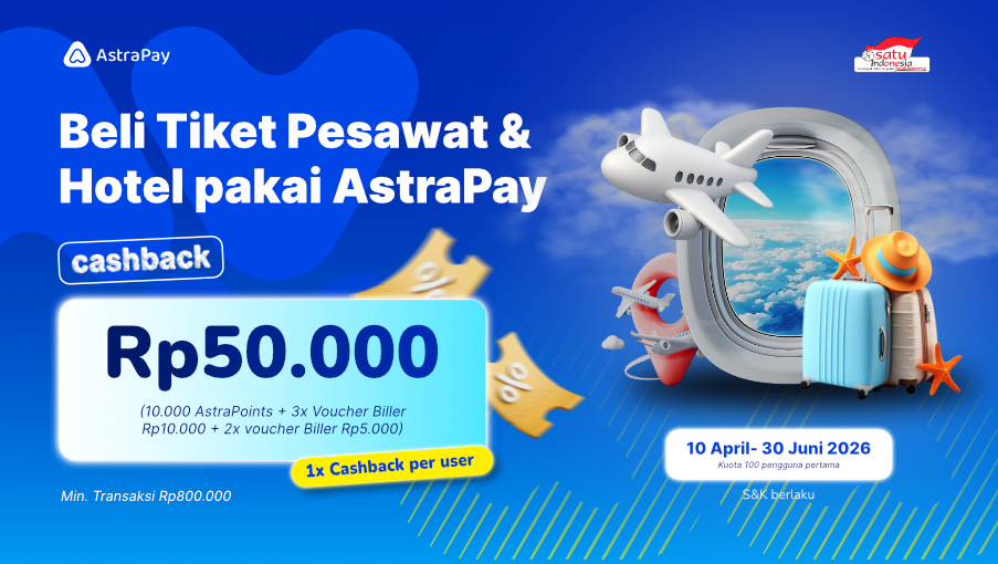 10 Apr 2026–30 Jun 2026Liburan Seru! Pesan Tiket Pesawat & Hotel Pakai AstraPay Cashback Rp50.000