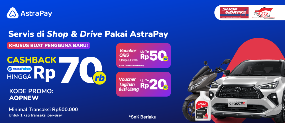 Masukkan Kode Referral AOPNEW dan bayar transaksi Shop & Drive kamu pakai AstraPay sekarang makin hemat! Nikmati Voucher Service Rp50.000 dan Voucher PPOB Rp20.000 (total hingga Rp70.000) dengan minimum transaksi Rp500.000 menggunakan QRIS AstraPay. Promo ini hanya bisa diklaim 1x per user dan kuotanya terbatas. Jadi, jangan sampai kelewatan! Yuk, bayar di Shop & Drive pakai AstraPay dan maksimalkan keuntungan transaksimu.